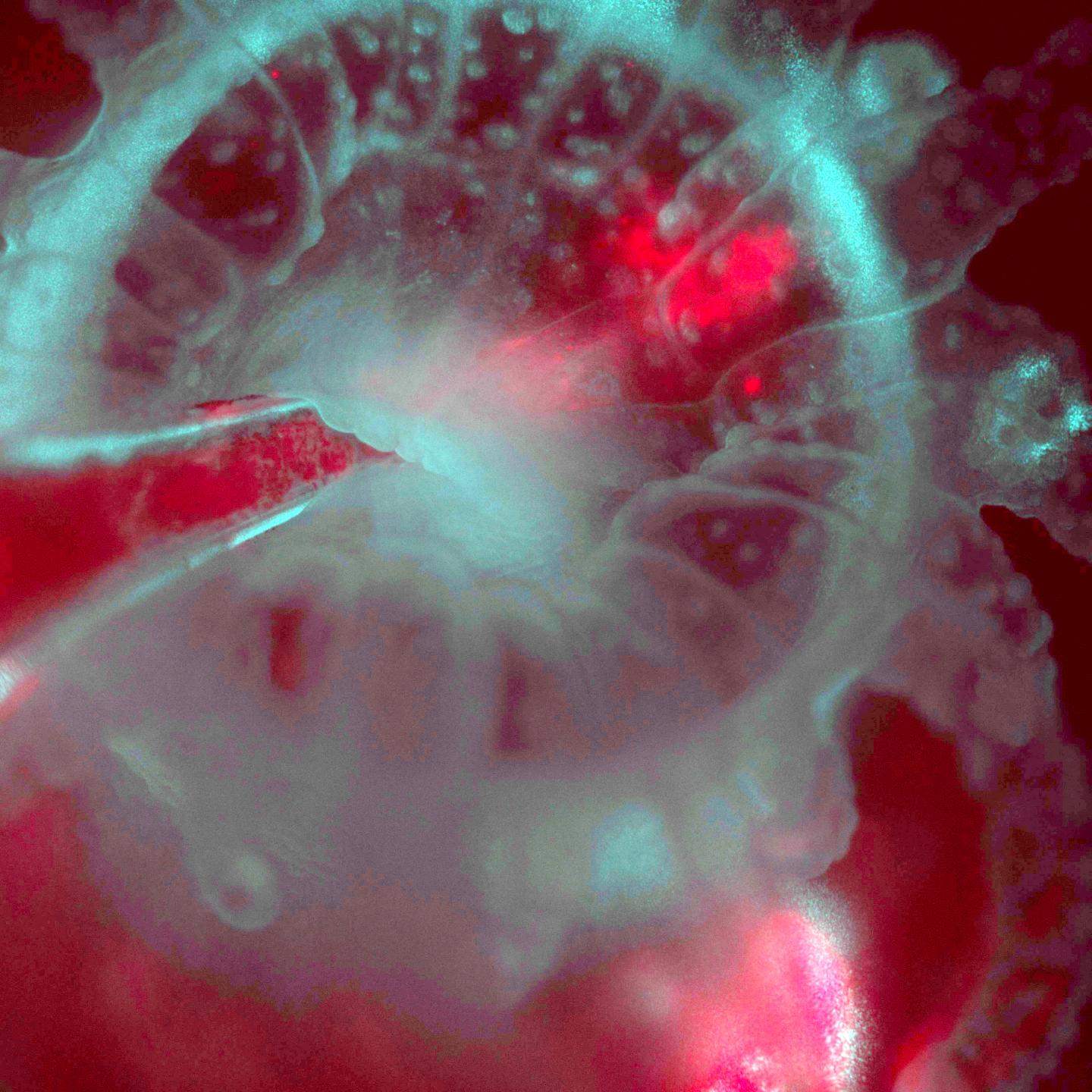 image: Using the L-SPI microscope to visualize the re-infection of an Astrangia polyp (cyan from reflected light) with algae (red from chlorophyll fluorescence), injected by pipette into the mouth of the polyp.