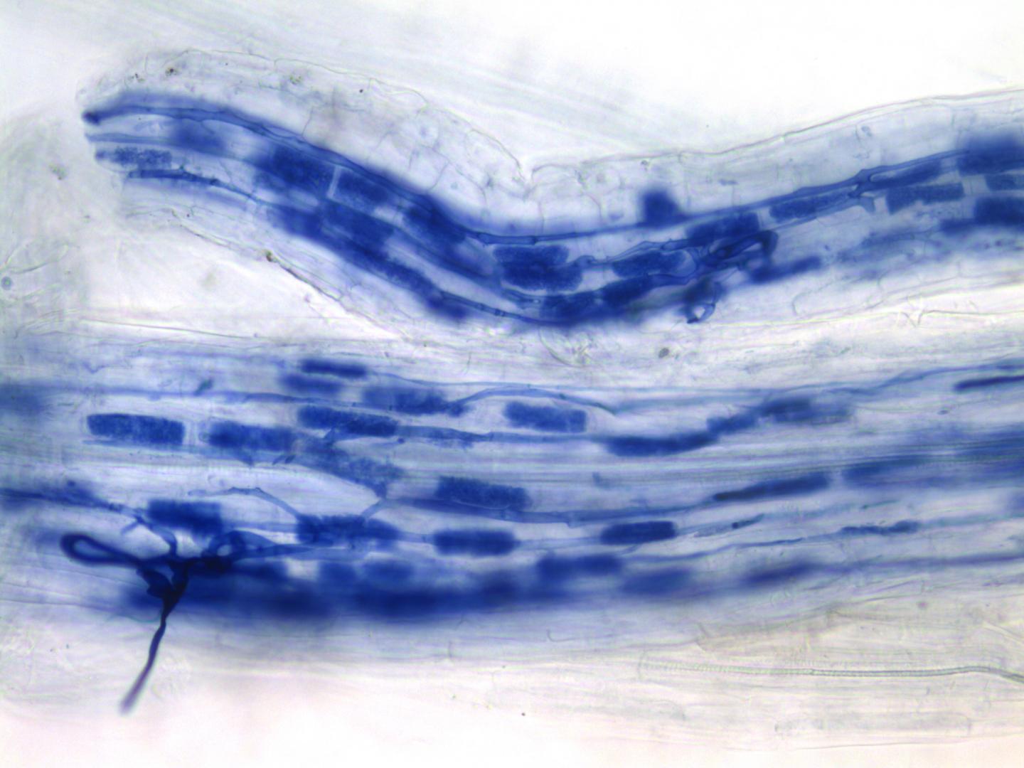 image: Blue-stained filaments of arbuscular mycorrhizal fungus, which lives in symbiosis with plants, inhabit plant roots in this microscope image.