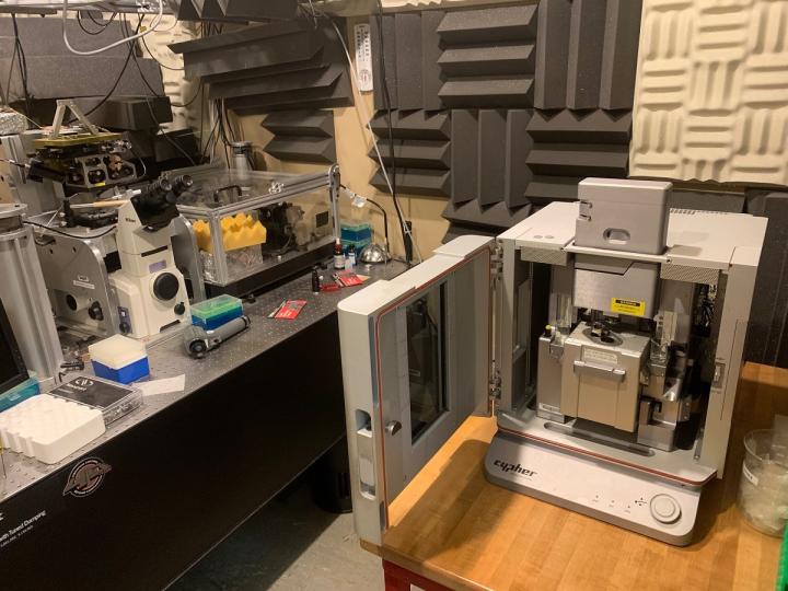 image: Gavin King and a team of scientists used this atomic force microscope, bottom right, to study the movement of the E.coli proteins. Unlike previous studies where proteins were frozen, the atomic force microscope allows researchers to observe the proteins moving in a fluid environment that closely resembles their natural environment.