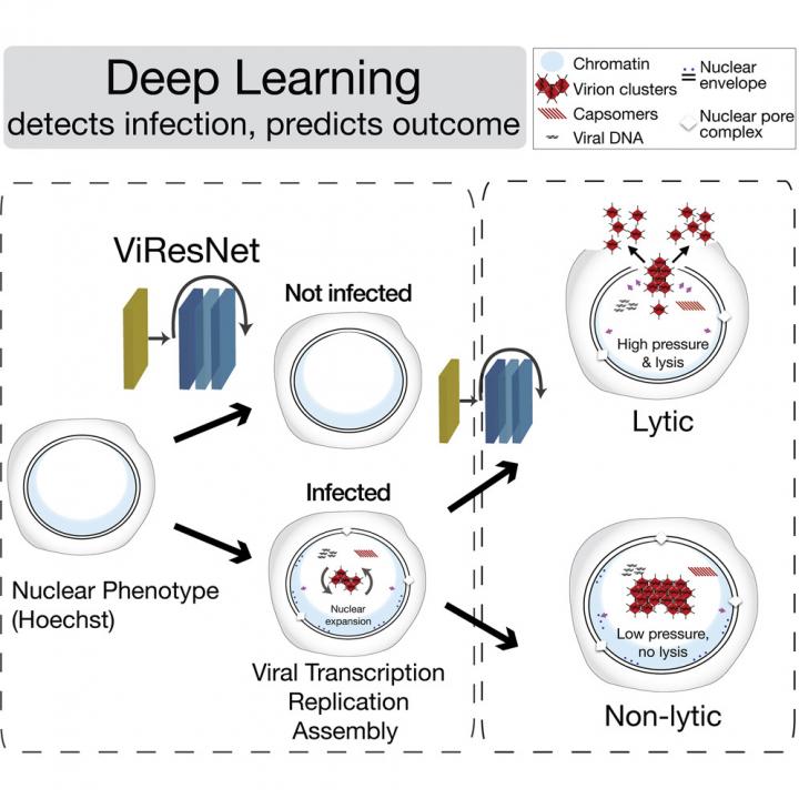 The research group of Urs Greber, Professor at the Department of Molecular Life Sciences at the University of Zurich (UZH), has now shown for the first time that a machine-learning algorithm can recognize the cells infected with herpes or adenoviruses based solely on the fluorescence of the cell nucleus. "Our method not only reliably identifies virus-infected cells, but also accurately detects virulent infections in advance," Greber says. The study authors believe that their development has many applications - including predicting how human cells react to other viruses or microorganisms. "The method opens up new ways to better understand infections and to discover new active agents against pathogens such as viruses or bacteria," Greber adds.