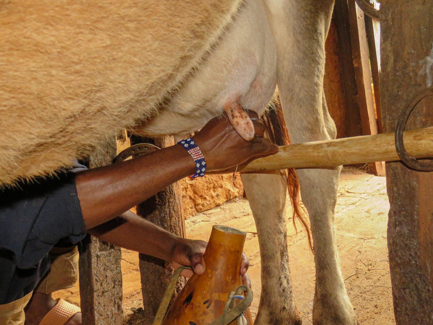 image: A modern day Kenyan collects fresh cow's milk in a gourd.