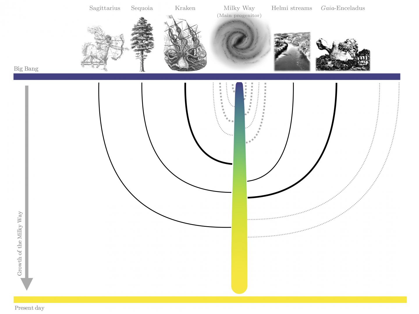 image: Family tree of the Milky Way. The main progenitor of the Milky Way is denoted by the trunk of the tree, coloured by stellar mass. Black lines indicate the five identified galaxies. Grey dotted lines depict other mergers that the Milky Way experienced that could not be connected to a specific progenitor. From left to right, the six images along the top of the figure indicate the identified progenitor galaxies: Sagittarius, Sequoia, Kraken, the Milky Way's Main progenitor, the progenitor of the Helmi streams, and Gaia-Enceladus-Sausage.