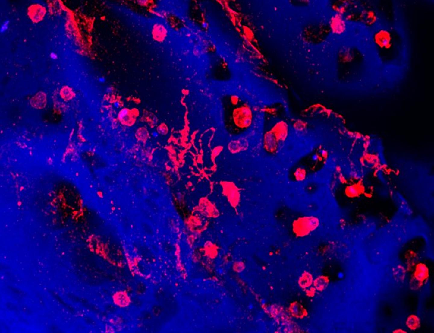 image: Platelets are created and released into the bloodstream by megakaryocytes, giant cells that live in the bone marrow. This image shows megakaryocytes (in red) forming platelets within a bone marrow mimic made with silk biomaterial.