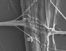 image: Scanning electron microscopy image of a human neuromuscular junction generated in microfluidic devices. Human induced pluripotent stem cell-derived motor neuron axons fan out and embed themselves into the human muscle tissue, which creates a large connection surface.
