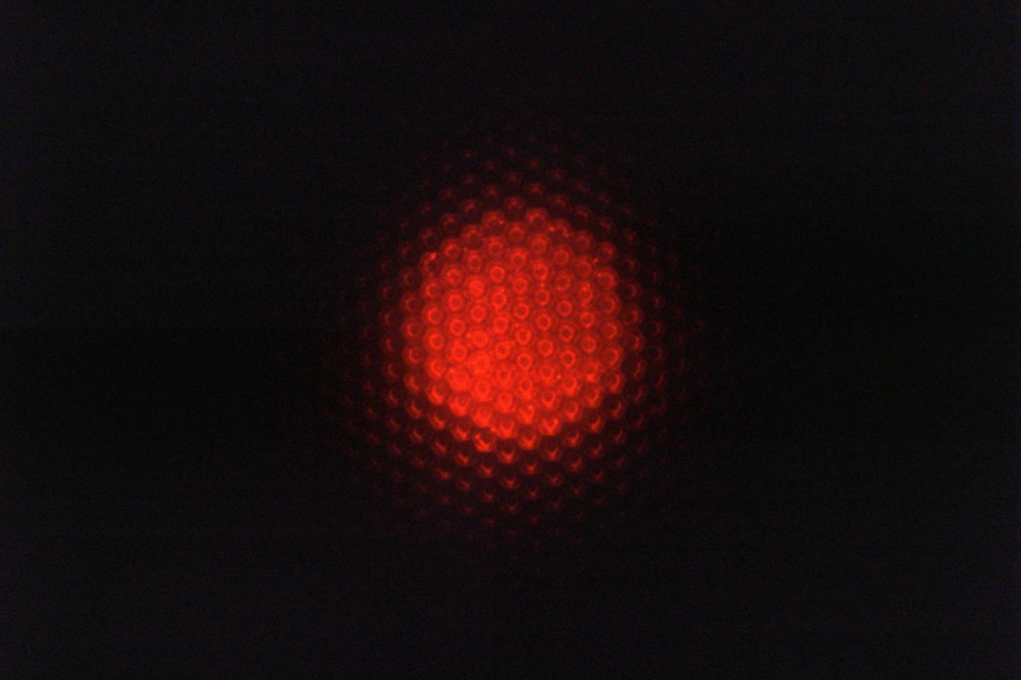 image: Optical micrograph of the inside of a luminescent substrate showing the red fluorescent emission from the quantum dot layer on top of the micro-patterned bottom reflector.