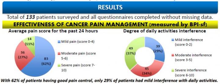 Overall, a good pain control was reported in 62% of survey participants (pain score Greater barriers for pain control were found in patients with higher education levels, which may reflect pervasive misconception of opioids use in social media. Fear of harmful effects from taking opioids was observed to be more common in the Malay community, followed by Chinese and Dayak groups. "These differences may reflect some inequities in access to optimal cancer care in the state, however multiple socio-economic factors may also play a critical role in the use of opioids, thus further investigations are needed", commented Dr Voon.