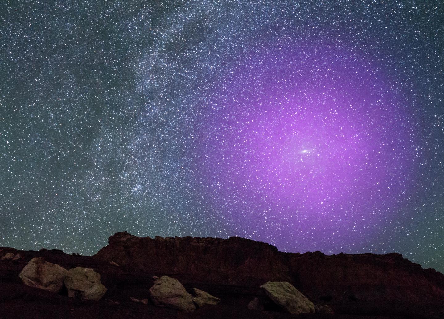 image: A new study has found that a share of particles that has been challenging to locate is most likely sprinkled across the distant bounds of galaxy halos. The study found some of these particles of baryonic matter are located up to 6 million light-years from their galactic centers. This color-rendered image shows the halo of the Andromeda galaxy, which is the Milky Way's largest galactic neighbor.