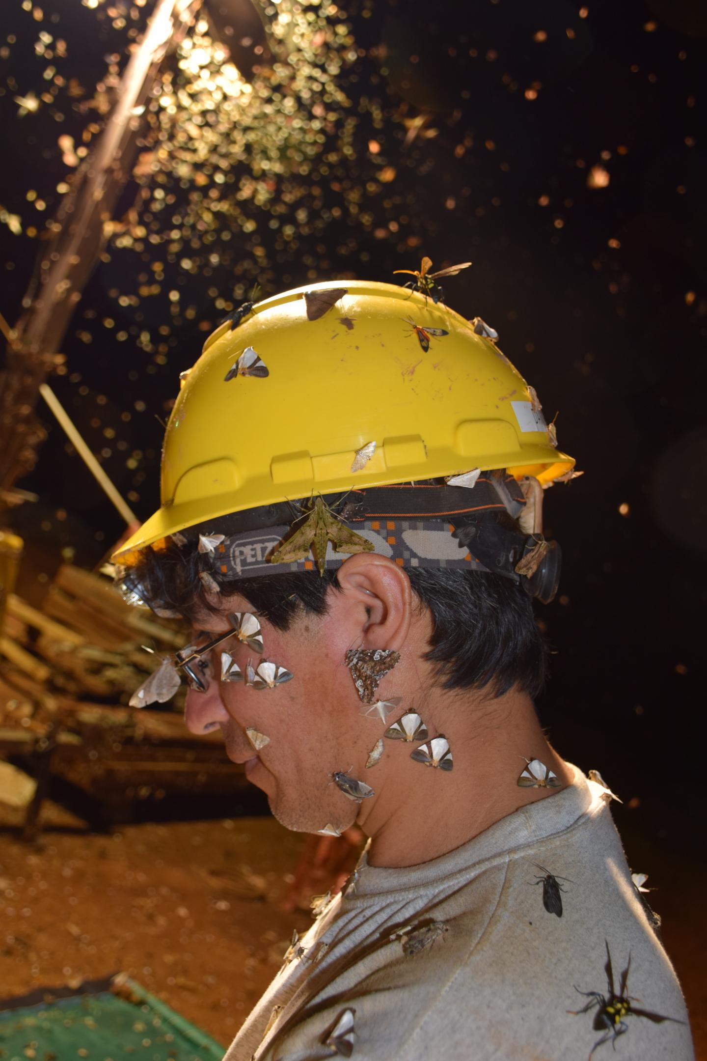 image: Smithsonian researcher covered in insects attracted to artificial light at night.