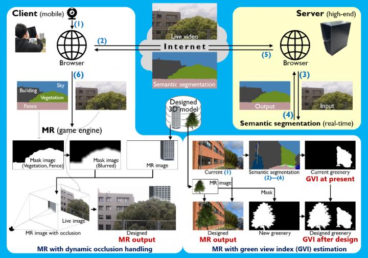 Live video is sent to a semantic segmentation server, and the result is used to render the final view with a game engine on the mobile device. Proposed structures and greenery can be shown even when the viewing angle is changed. "Internet speed and latency were evaluated to ensure real-time MR rendering," first author Daiki Kido explains. The team hopes this research will help stakeholders understand the importance of GVI on urban planning.
