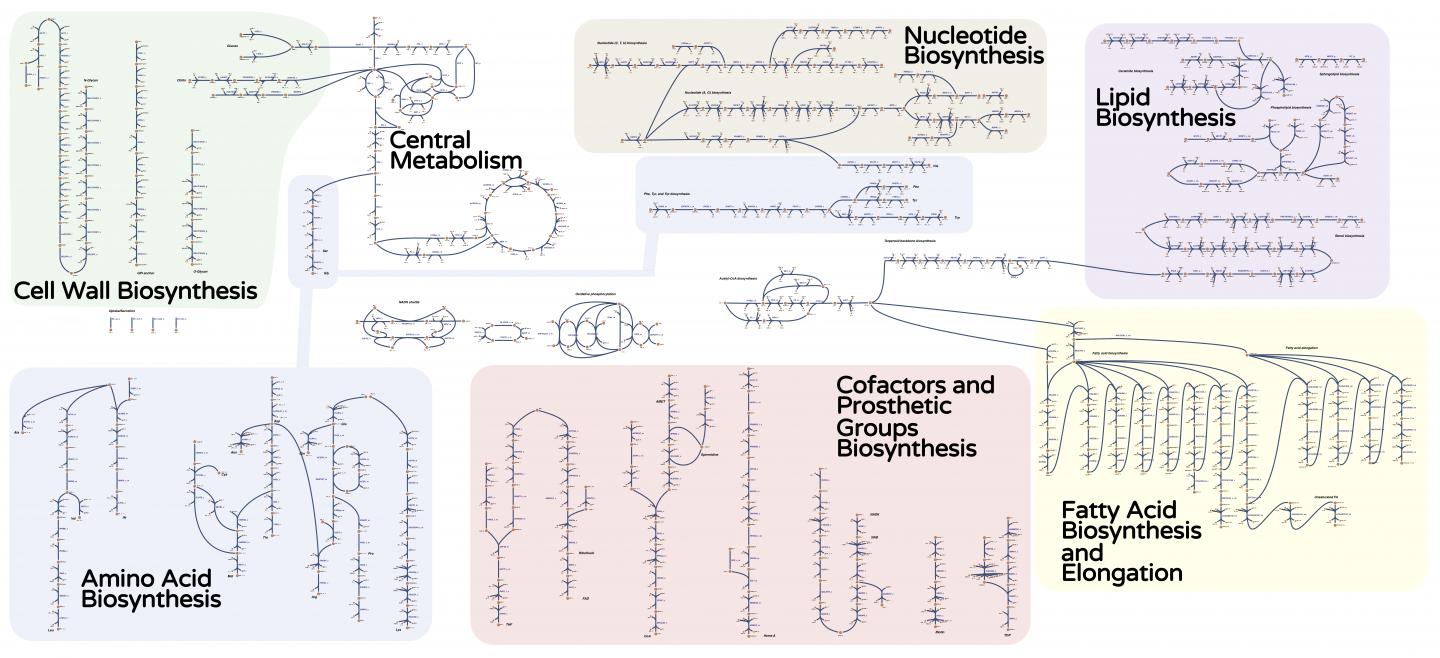 image: Escher map of core pathways in iIsor850. An Escher map consists of metabolites (circles) connected via reactions (lines) which indicate directionality ofallowable fluxes (arrows). The core components of iIsor850 were drawn and placed according to relevant classifications. For clarity, not all reactions for the metabolitesare shown, and some metabolites occur more than once (i.e., cofactors). Amino acid biosynthesis is indicated in blue, nucleotide biosynthesis is brown, lipidbiosynthesis is purple, cell wall biosynthesis is green, fatty acid biosynthesis and elongation is yellow, cofactors and prosthetic groups biosynthesis is red. Centralmetabolism is uncolored in the middle-top of the figure.