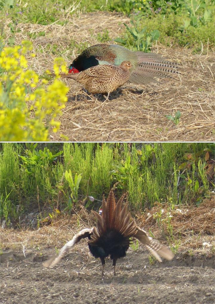 image: Display behaviors of pheasants showing the fan-shaped tail.