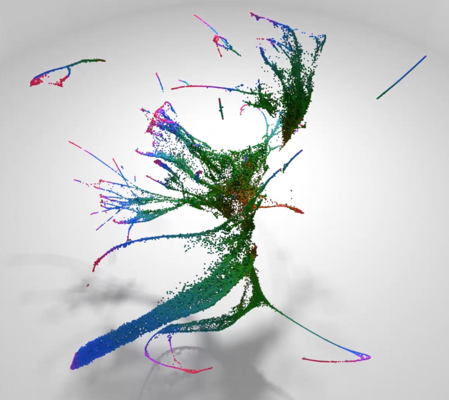 image: Each cell of a developing nematode worm embryo is catalogued at the molecular level in a new paper out in Science. In this visualization of the dataset, each dot represents a single cell, its color represents the age of the embryo it came from (orange=early, green=mid, blue/red=late), and the dots are arranged so that cells with similar transcriptomes are near each other. Visualized this way, the data form various thin "trajectories" that correspond to tissues and individual cell types.