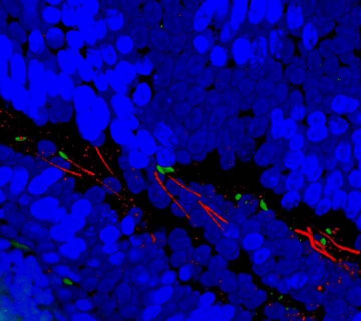 image: Three-dimensional image showing the head (green) and tail (red) of sperm cells travelling towards the fertilisation site (to the left side of the image) in the reproductive tract (blue cells) of a female mouse