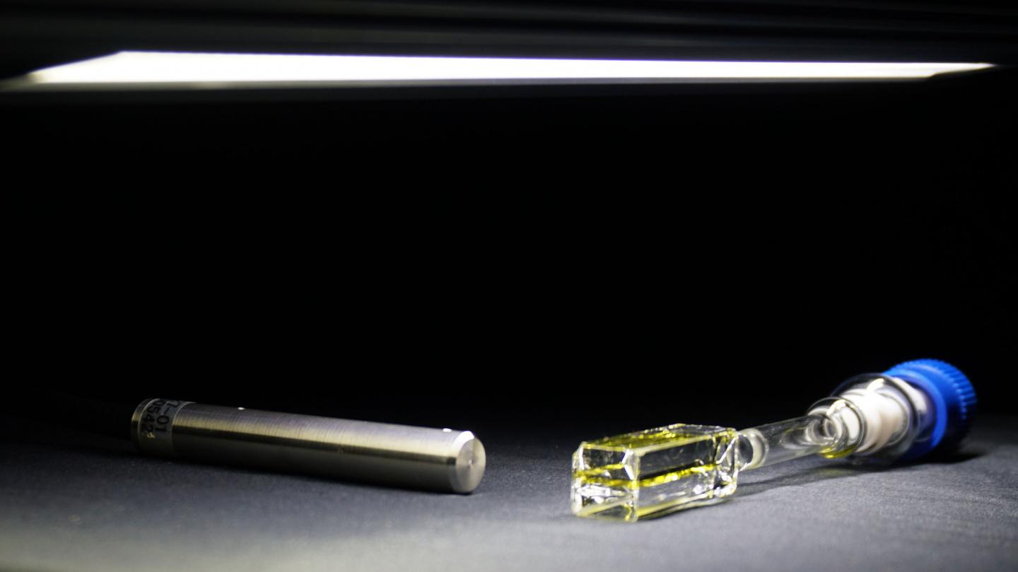 image: A newly developed molecular system in the glass tube on the right efficiently upconverts visible light even from typical LEDs into ultraviolet light through triplet-triplet annihilation. Developed by researchers at Kyushu University, the system achieves an upconversion efficiency of 20% under high-intensity light, doubling previous records, while also being relatively efficient even under weak light.