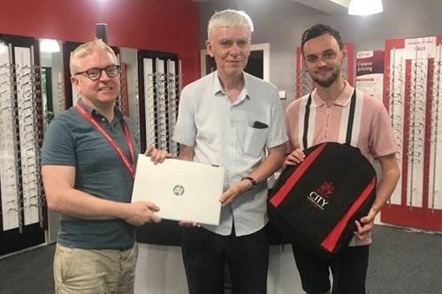image: Dr Peter Campbell (left) with study participant, Graham Maynard (centre), holding the EyeCatcher glaucoma monitoring system, and Dr Lee Jones (right) at the City Sight clinic.