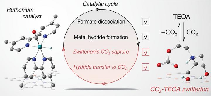 For example, TEOA acts as a proton source supporting the formation of a metal hydride (ruthenium attached to hydrogen) that subsequently interacts with CO2 to make bound formate (bound to ruthenium). Moreover, TEOA interacts with CO2 to form a "zwitterionic adduct," a molecule containing both positive and negative electrical charges. When this adduct is present in solution, the metal hydride interacts with CO2 to make bound formate at a rate that is six orders of magnitude faster than that without TEOA. The dissociation of bound formate into "free" formate--which can be captured as the final product--is also six orders of magnitude faster because of TEOA.