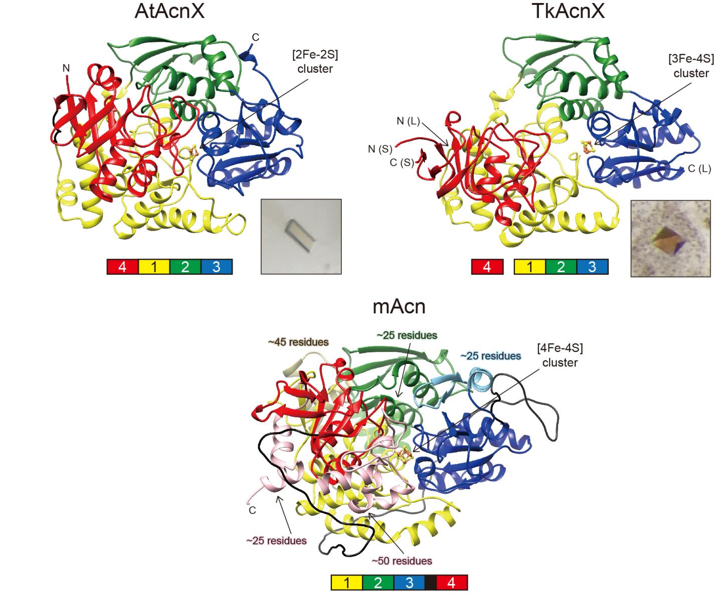 image: These molecules commonly contain the indicated [Fe-S] cluster, and consist of four distinct domains 1 (yellow), 2 (green), 3 (blue), and 4 (red) and a linker region (black). The small subunit of TkAcnX corresponds to fragmented domain 4. In comparisons with AcnX, several large insertions in domains 1-4 of mAcn were colored in ocher, light-green, light-blue, and pink, respectively.
