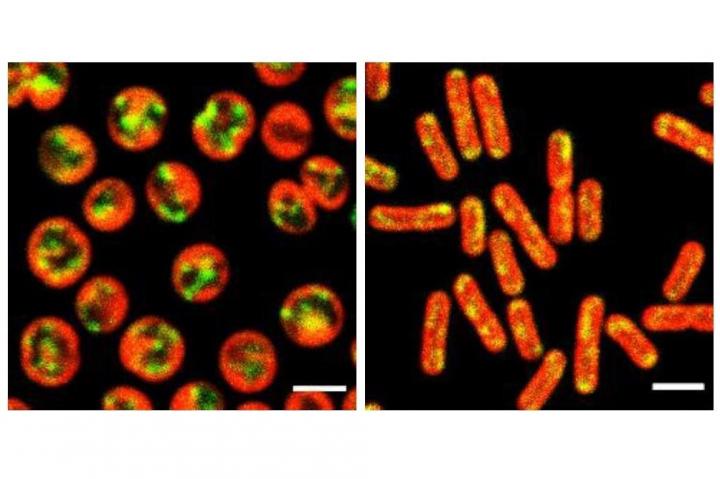 image: Confocal microscope image of two different cyanobacterial strains: Autofluorescence of the pigments of the thylacoid membrane (red), the signals of mRNAs (green) and the colocalization of both signals (yellow).