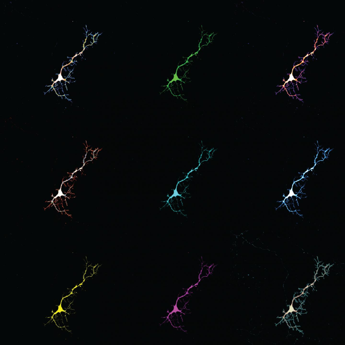 image: Collage of neuron cells used in this study. Neurons here are expressing a protein that fluoresces upon binding bilirubin.