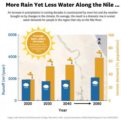 image: An increase in precipitation in coming decades is counteracted by more hot and dry weather brought on by changes in the climate. On average, the result is a dramatic rise in unmet water demands for people in the region that rely on the Nile River.