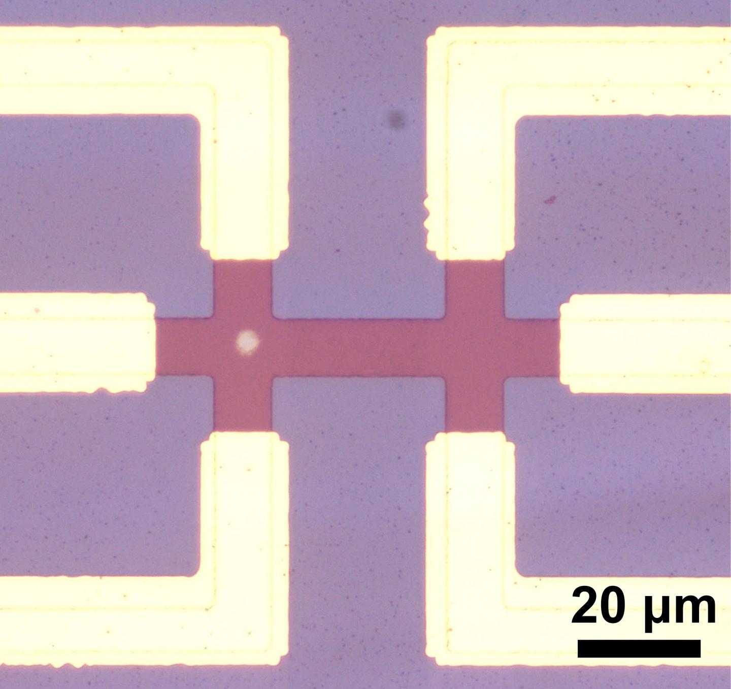 image: Microscope image of one of the studied devices, consisting of two crosses with the same dimensions, where one has an IrMn3 pillar and the second consists only of Pt.
