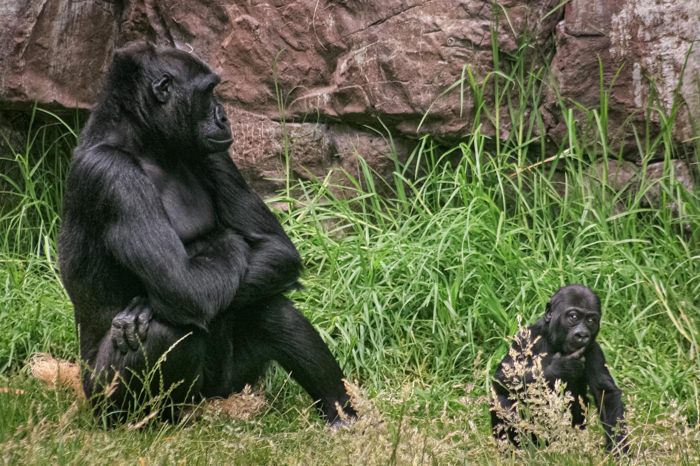 image: Female gorilla with 8 months old offspring in zoo