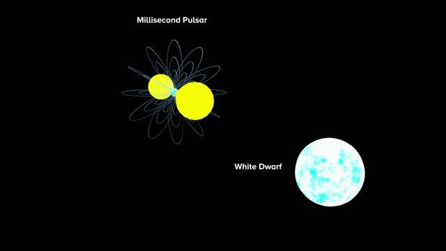 video: Artist impression and animation of the Shapiro Delay. As the neutron star sends a steady pulse towards the Earth, the passage of its companion white dwarf star warps the space surrounding it, creating the subtle delay in the pulse signal.