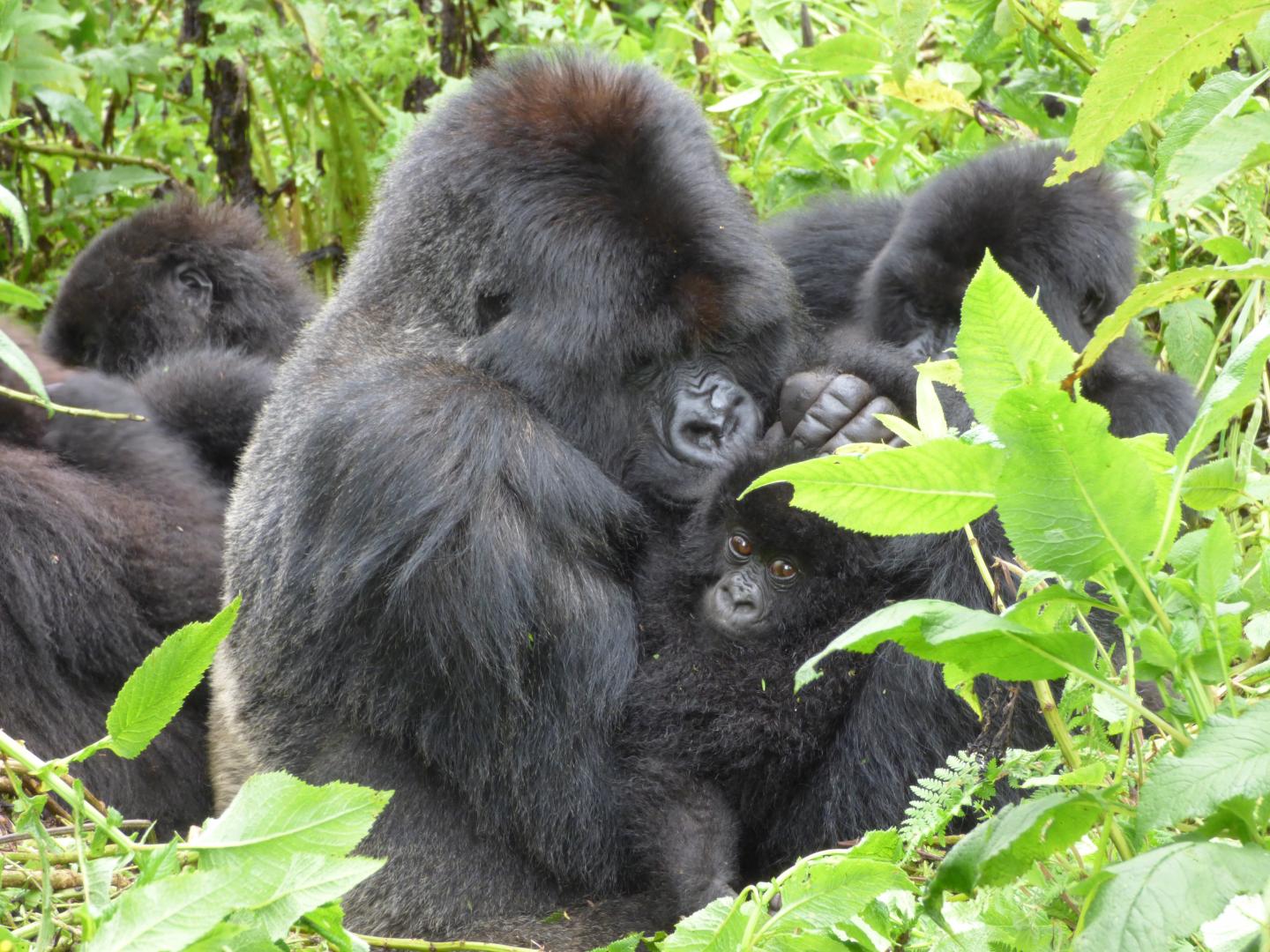 Mountain gorillas live in close-knit "family" groups including a dominant silverback male who leads the group, multiple adult females, their immature offspring and, in some cases, subordinate adult males.