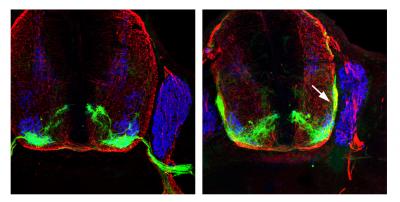 The researchers set up a series of experiments to examine how p190 affects axons leaving the spinal cord. They found that, although axons are normally attracted to a protein in the spinal cord called netrin, during a short time window p190 acts as a blinder, so the axons disregard netrin and are led outside of the spinal cord. After the axons safely leave the central nervous system, this blinder is removed. Without p190, the axons are attracted to netrin and do not properly leave the spinal cord, so never connect with muscles.