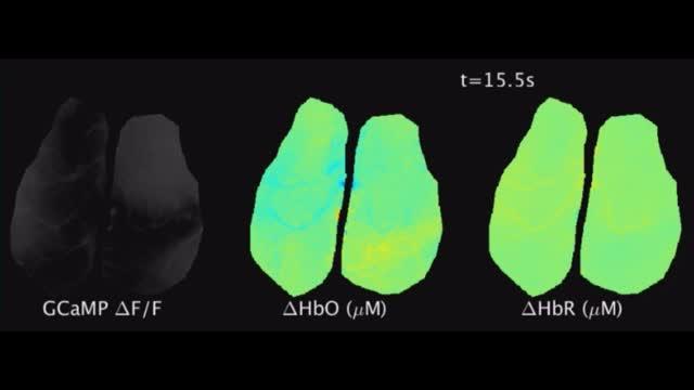 video: Real-time imaging of a spontaneous glioma-induced seizure in the brain of a mouse. Left shows neuronal calcium activity across the surface of the brain, center and right show changes in oxy-hemoglobin (HbO) and deoxy-hemoglobin (HbR) respectively. The tumor is located in the top right quadrant.