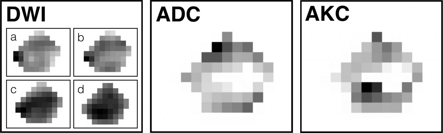image: Two-dimensional sections of a three-dimensional acquisition of images of a malignant tumor. Diffusion weighted imaging (DWI) with b values of (a) 0, (b) 100, (c) 750, and (d) 1500 sec/mm2. Apparent diffusion coefficient (ADC) map and apparent kurtosis coefficient (AKC) map show the resulting pixel values after Kurtosis fitting. Notably, white pixels inside lesion constitute background after exclusion for not matching the fit criteria.