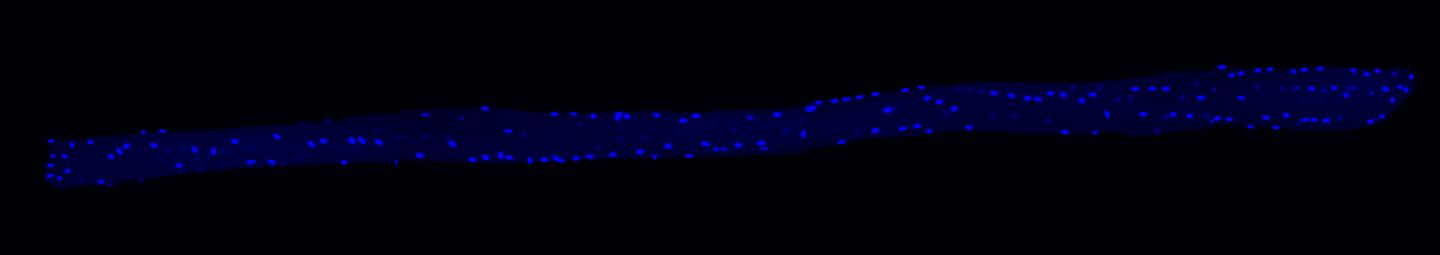 image: In this single muscle fiber, a multitude of nuclei can be clearly seen. The researchers used DAPI for staining, it stains the DNA in the nuclei blue.