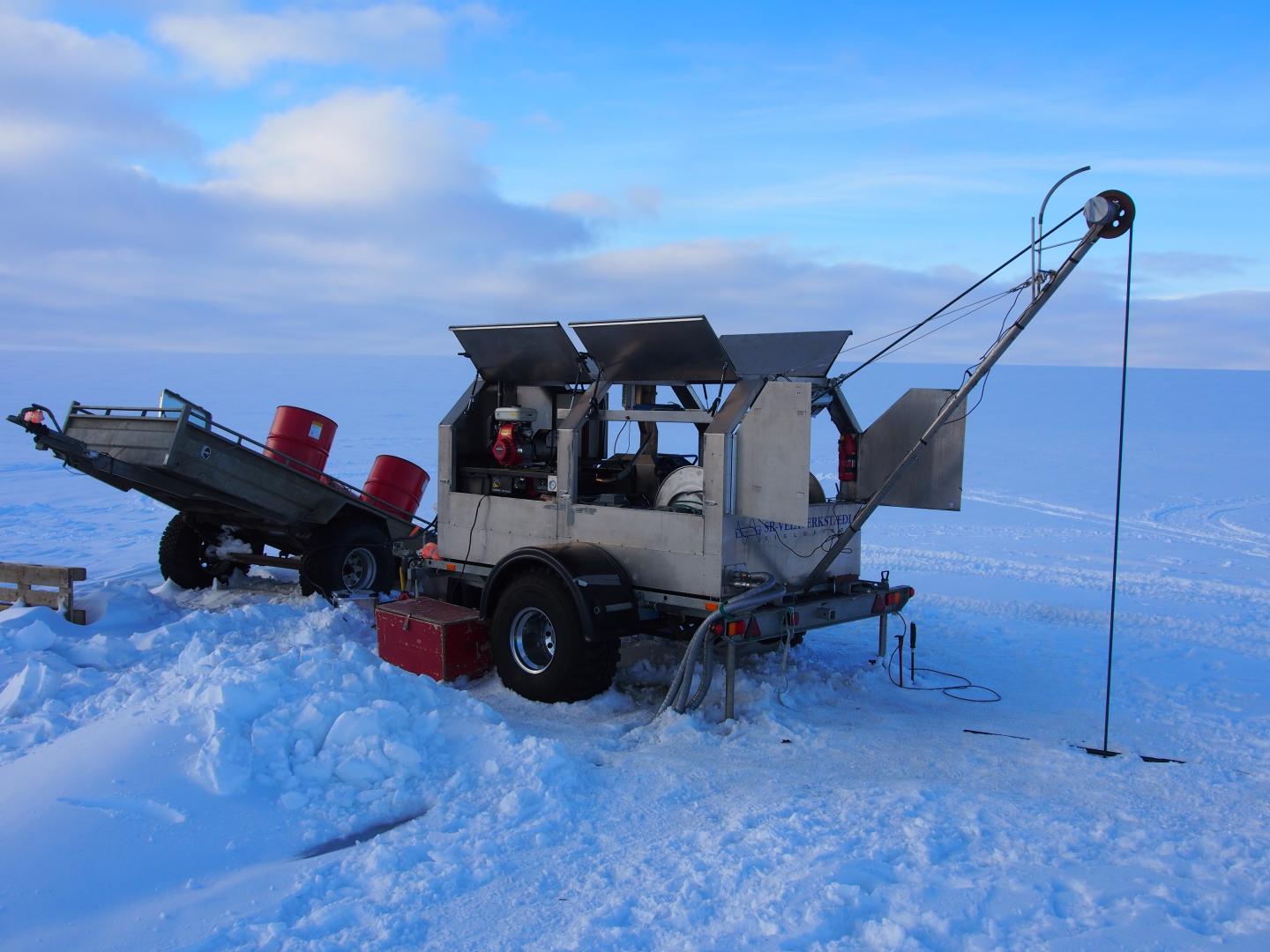 image: The hot water drill used to drill through the glacier to the subglacial lakes. The drill stem is hundreds of meters below in the ice, suspended on a rubber hose through which hot water is pumped down.