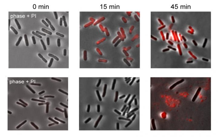 image: Top row: E coli bacteria containing a retron break apart the membranes in the cell around 15 minutes after infection (center) Red reveals holes in membranes as cells die. (Right) 45 minutes post infection with a phage, many cells have died, but a few remain to restart growth. Bottom: bacteria lacking this retron look fine after 15 minutes, but 45 minutes later, the infected cells have died and the viral DNA has spilled out, on its way into the remaining few cells