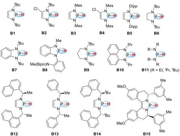 Recently, N-heterocyclic phosphines (NHPs) have emerged as a new group of promising catalysts for metal-free reductions. Their excellent hydricity of the P-H bond, which rivals or even exceeds those of many metal-based hydrides, is the result of hyperconjugative interactions between the lone-pair electrons on N atoms and the adjacent sigma*(P-H) orbital, as reflected by the resonance structures of the diazaphospholene skeleton. The umpolung reactivities of phosphines derived in this way stimulated researchers to identify innovative structures with comparable or enhanced hydricities. Significant developments in the past decade have made P-H hydrides an attractive research area in main-group hydrides. Many NHPs (Scheme 1) with diverse structures and reactivities have been developed and used as powerful stoichiometric or catalytic reductants in organic syntheses, such as catalytic reduction of polar unsaturated bonds and the hydroboration of pyridines.