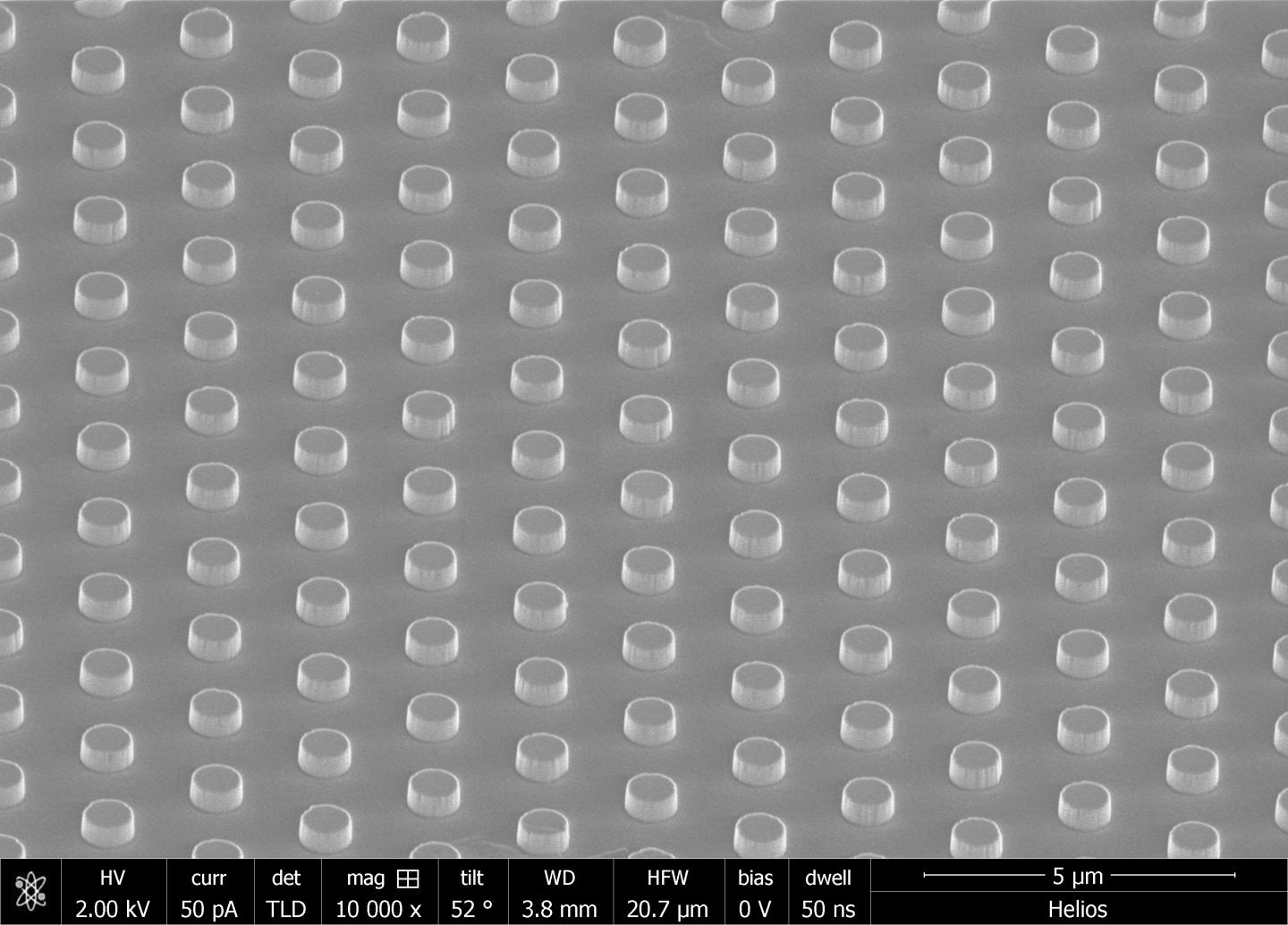 image: An electron microscope image shows an array of thermal light emitters created by Rice University engineers. The emitters are able to deliver highly configurable thermal light. (Credit: The Naik Lab/Rice University)
