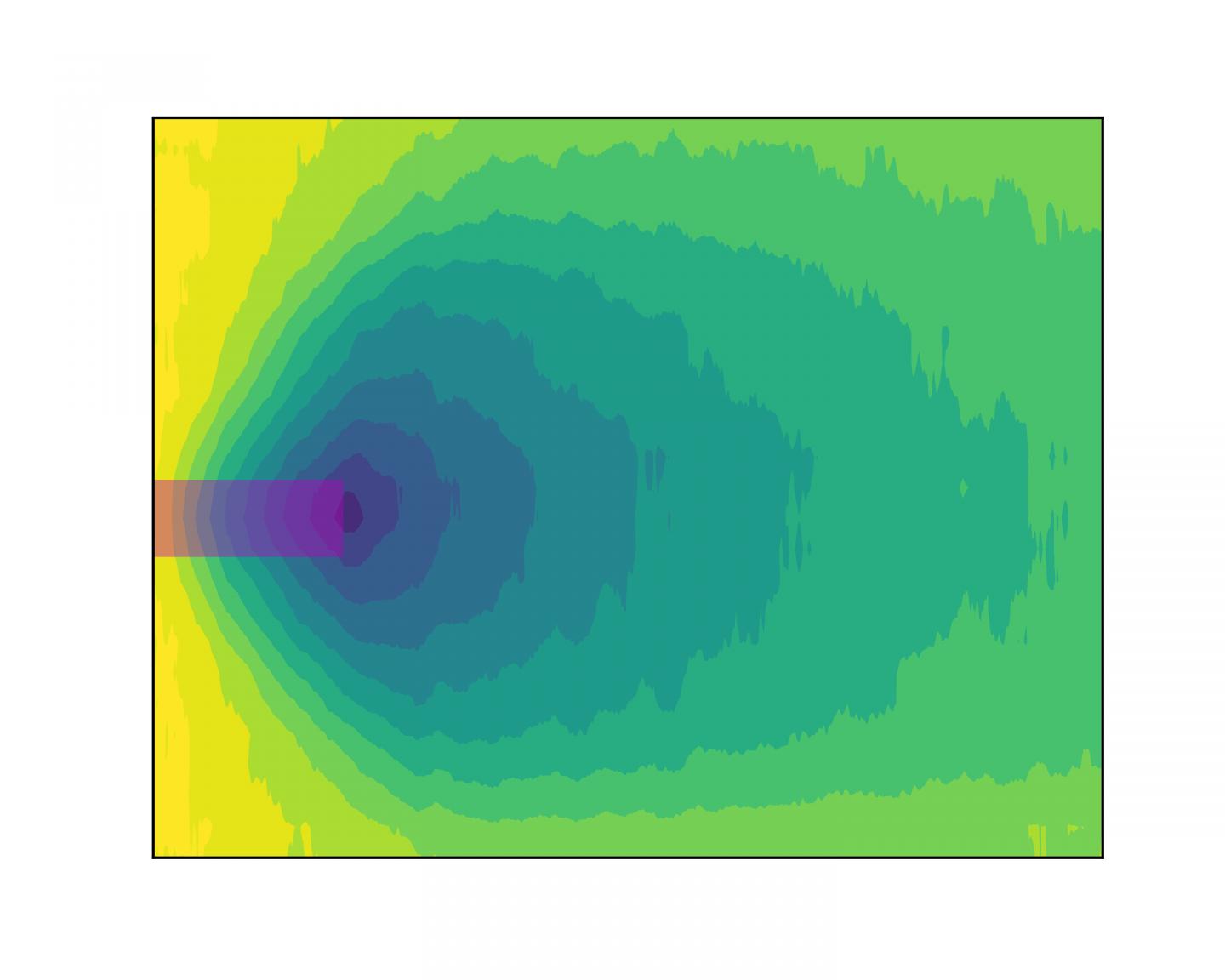image: Colorized plot of the light-assisted curing of a polymer over five seconds, as measured with NIST's custom atomic force microscope with a nanocylinder probe. Darker colors indicate a higher level of conversion from a liquid resin to a polymer. The magenta block at left represents the light fixture that initiates the reaction.