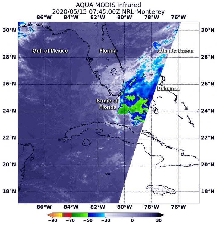 image: On May 15, 2020, at 3:45 a.m. EDT (0745 UTC), the MODIS instrument that flies aboard NASA's Aqua satellite gathered infrared data on 90L. Strongest thunderstorms had cloud top temperatures (yellow) as cold as minus 50 degrees Fahrenheit (minus 45.5 Celsius) over the Straits of Florida.