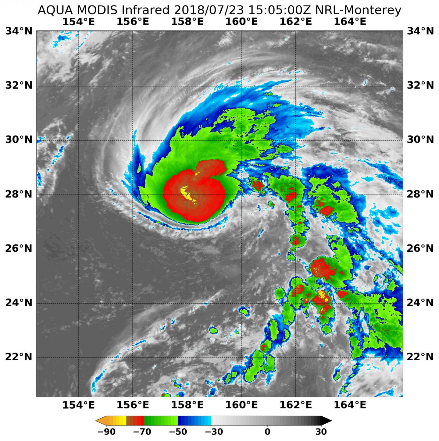 The Moderate Resolution Imaging Spectroradiometer or MODIS instrument aboard Aqua provided that infrared data on July 23 at 11:05 a.m. EDT (1505 UTC). MODIS data showed the strongest thunderstorms were as cold, or colder than minus 70 degrees Fahrenheit (minus 56.6 degrees Celsius). NASA research has found that storms with very cold cloud tops have the potential to generate very heavy rainfall. Those storms circled the low-level center and extended into the beginning of a fragmented band of thunderstorms to the northeast, which made it resemble a leaf attached to a strawberry.