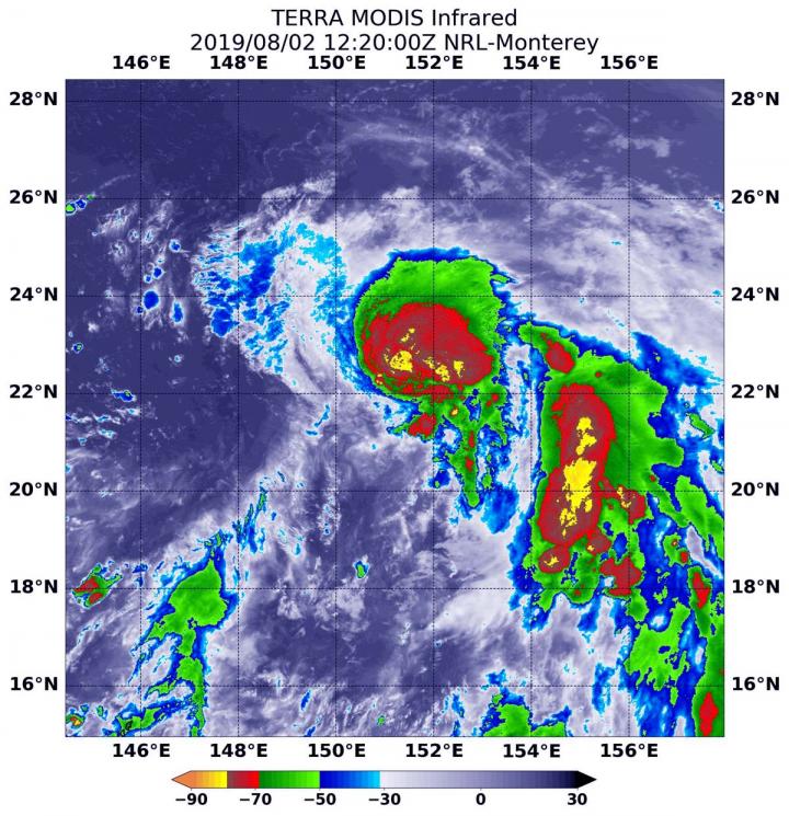 On August 2 at 8:20 a.m. EDT (1220 UTC) the Moderate Imaging Spectroradiometer or MODIS instrument that flies aboard NASA's Terra satellite found coldest cloud top temperatures as cold as minus 80 degrees Fahrenheit (minus 62.2 Celsius). Cloud top temperatures that cold indicate strong storms with the potential to generate heavy rainfall.Those strongest storms were seen around the center and in fragmented bands of thunderstorms circling the center. Those temperatures were also found in a large band of thunderstorms feeding into the center from the east.
