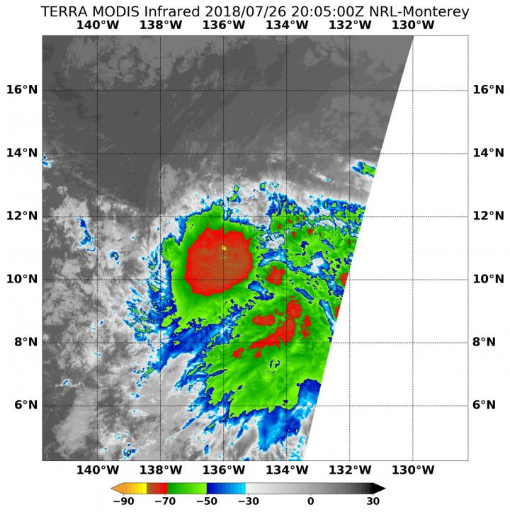 image: NASA's Terra satellite on July 26 at 4:05 p.m. EDT showed storms surrounding 9E's center were as cold as minus 70 degrees Fahrenheit (minus 56.6. degrees Celsius). Strong storms also appeared in a band of thunderstorms wrapping into the center from the southeast. Those indicate strong storms with the potential for heavy rainfall.