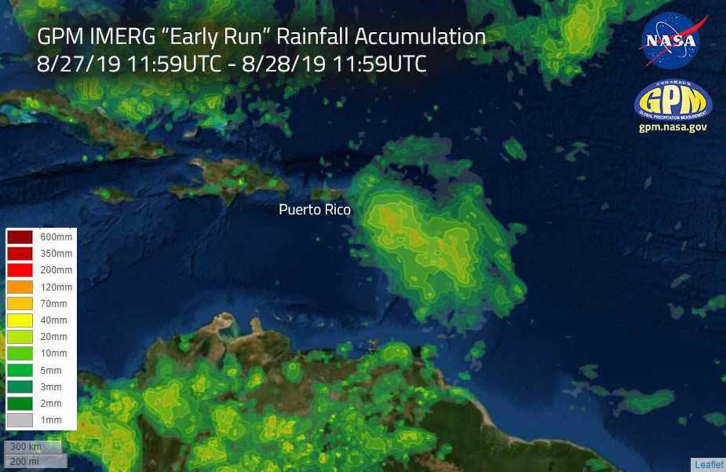 image: This image shows estimated rainfall accumulations for the region affected by Hurricane Dorian over the 24 hour period of Aug. 27, 2019 at 11:59 UTC to Aug. 28, 2019 at 11:59 UTC. The imagery was generated using the Integrated Multi-satEllite Retrievals for GPM (IMERG) "early run" product. The data indicates that up to 120 mm (4.72 inches) of rainfall accumulated in certain regions during the 24 hour period.