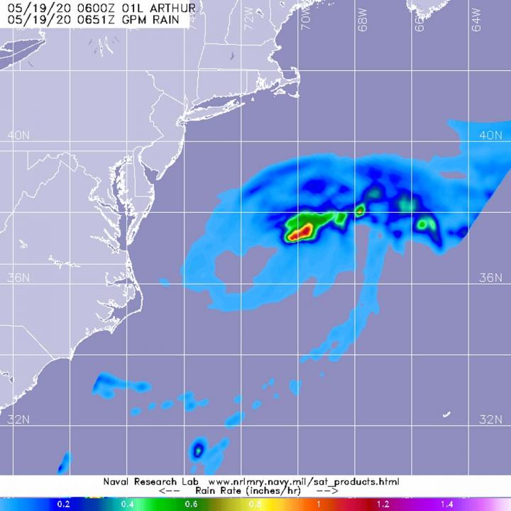 The GPM's core satellite passed over Arthur on May 19 at 2:51 a.m. EDT (0651 UTC) and found the heaviest rainfall on the northeastern side of the storm falling at a rate of over 25mm (over 1 inch) per hour. Lighter rainfall rates were measured throughout the rest of the storm. Forecasters at NOAA's National Hurricane Center or NHC incorporate the rainfall data into their forecasts.