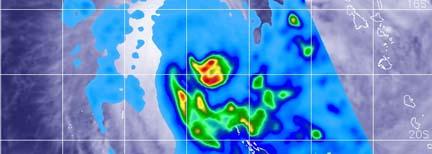 image: The GPM core satellite passed over the Southern Pacific Ocean and analyzed rainfall occurring in Tropical Storm Uesi on Feb. 10 at 2:31 a.m. EST (0731 UTC). Heaviest rainfall (red) around the center falling at a rate of 1.2 inches (30 mm) per hour. In a large band of thunderstorms south of the center, rainfall occurring at a rate of 1 inch (25 mm) per hour (orange). Light rain (blue) was found throughout the rest of the storm.