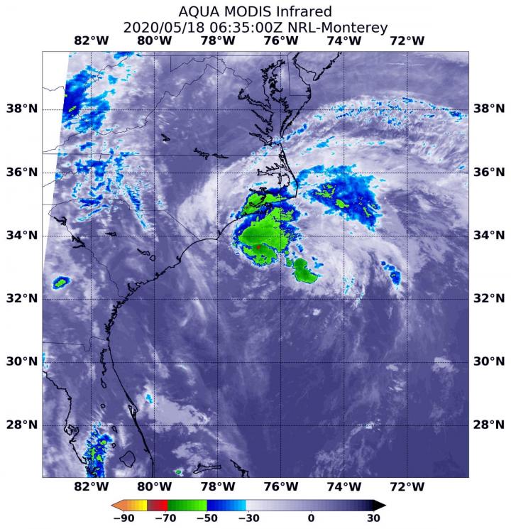 On May 18 at 2:35 a.m. EDT (0635 UTC), the MODIS instrument that flies aboard NASA's Aqua satellite showed strongest storms in Tropical Storm Arthur were along the southeastern coast of North Carolina and just off-shore. Those strong storms contained cloud top temperatures were as cold as minus 63 degrees Fahrenheit (minus 52.7 Celsius). Cloud top temperatures that cold indicate strong storms with the potential to generate heavy rainfall.