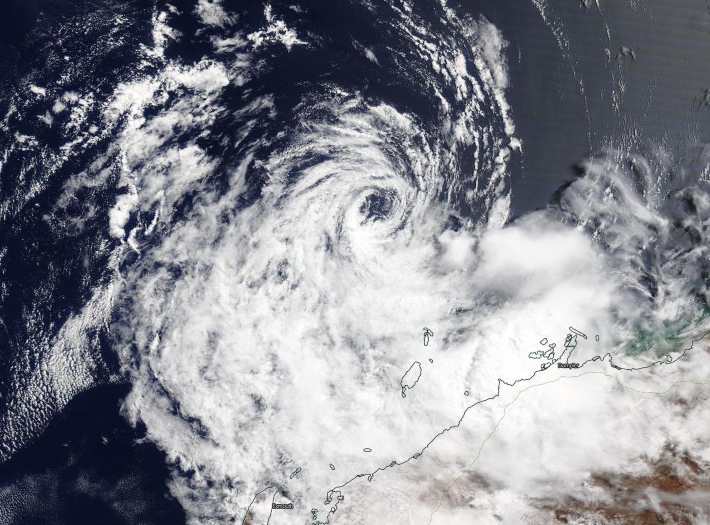 image: On Mar. 12, 2020, the MODIS instrument that flies aboard NASA's Terra satellite provided a visible image of Ex-Tropical Cyclone 21S, affecting Western Australia's Pilbara coast.