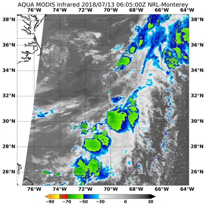 NASA's Aqua satellite identified a few scattered storms with coldest cloud top temperatures near minus 63 degrees Fahrenheit/minus 53 degrees Celsius). Storms with cloud top temperatures that cold have the capability to produce heavy rainfall.