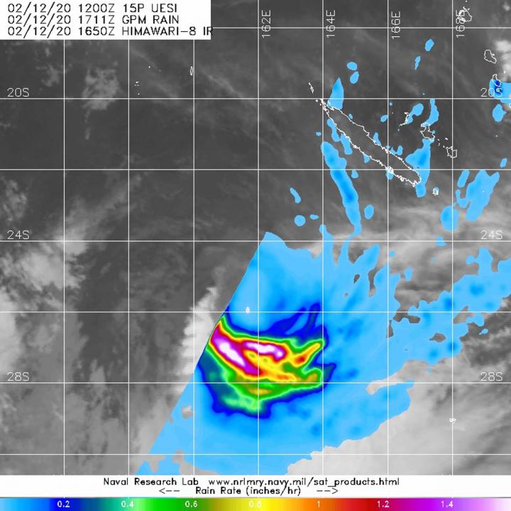 The GPM's core satellite passed over Uesi on Feb. 12 at 12:11 p.m. EST (1711 UTC). GPM found heaviest rainfall southwest of the center, falling at a rate of 1.6 inches (40 mm) per hour. Directly south of the center were areas where rainfall rates were falling at a rate of 1 inch (25 mm) per hour. Scattered light rain, falling at less than 0.2 inches (less than 5 millimeters) per hour appeared to be occurring in the rest of the storm.