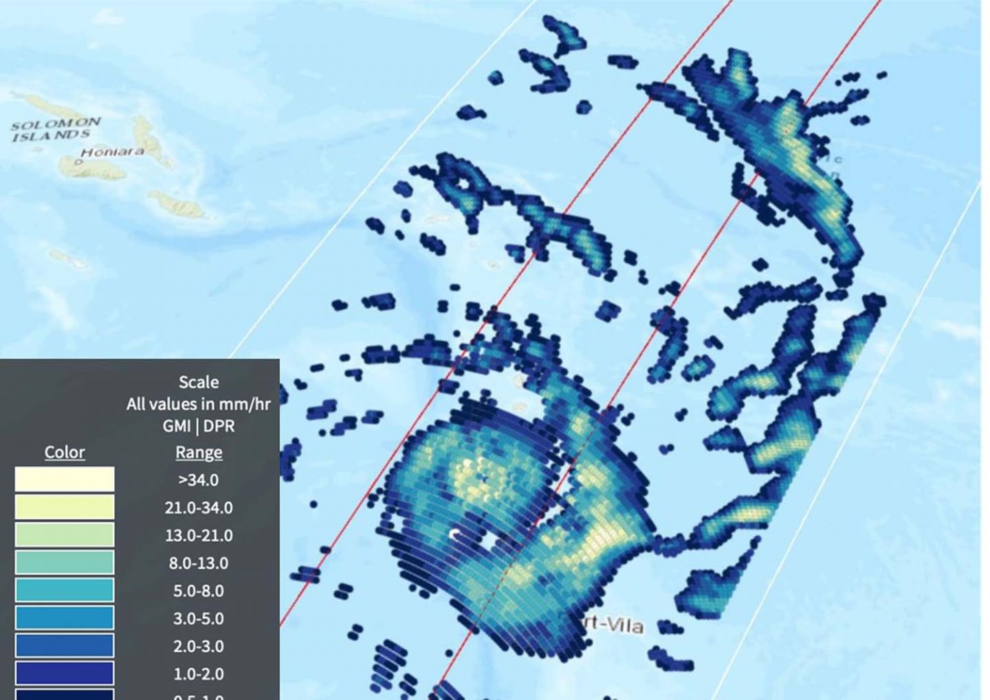 image: On April 6, 2020, the GPM satellite provided an estimate of rainfall rates in powerful Tropical Cyclone Harold over Vanuatu in the Southern Pacific Ocean. The highest rates were in the rain band to the southeast of the eye, at 48 mm (1.8 inches) per hour. Near the eye, rates in some areas also exceeded 40 mm (1.6 inches) per hr.