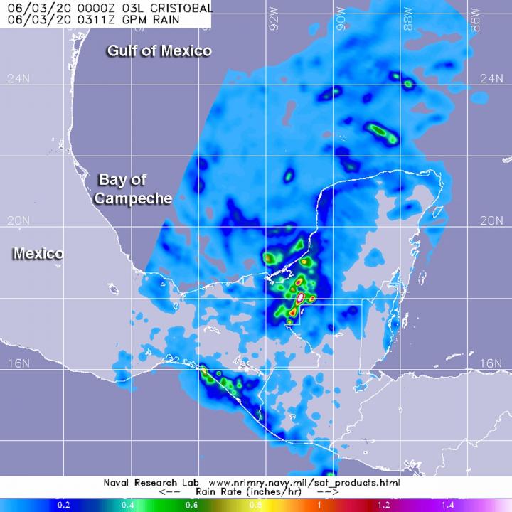 The Global Precipitation Measurement mission or GPM satellite provided a look at Cristobal's rainfall rates on June 3 at 0311 UTC (June 2 at 11:11 p.m. EDT). GPM found heaviest rainfall south of center over Mexico's Yucatan Peninsula, falling at rates of more than 1 inch (25 mm) per hour. Lighter rain rates appear around the entire system.